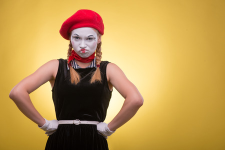 Close-up portrait of indignant female mime with white funny face, red hat and red scarf looking at the camera isolated on yellow background with copy place