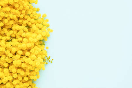 Mimosa flowers border on a light blue background. Spring, Easter, Womens day concept. Copy space, top view.