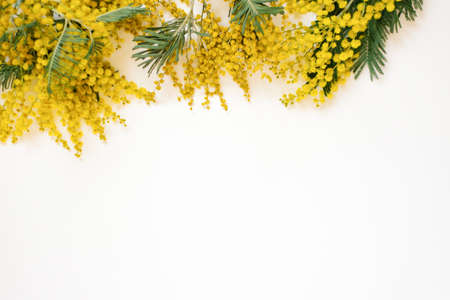 Mimosa flowers border on a white wooden background. Easter, Mothers Day, Womens day concept. Copy space, top view.