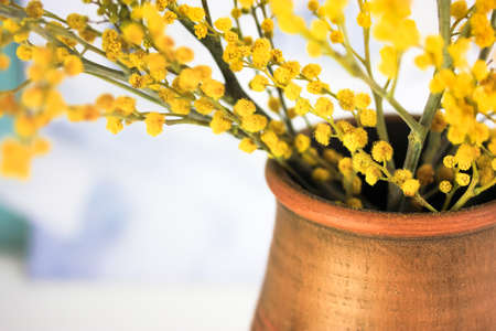 Beautiful yellow mimosa flowers in a vase on a gray background. selective focus.