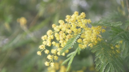 Flowering mimosa tree. Mimosa blooms. Selective focus. The flowery branch of mimosa is offered to women on March 8th for the International Women's Day.
