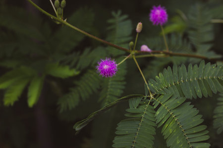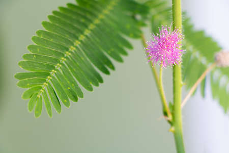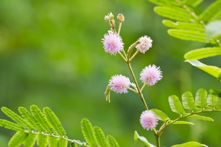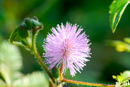 Flower and bud of sensitive plant, sleepy plant, action plant, touch-me-not, shameplant with blurred background.