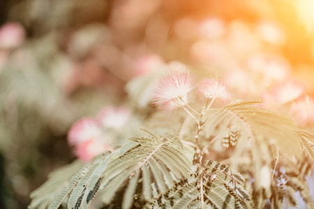 Albizia julibrissin with green leaves and pink fluffy flowers - also named Persian silk tree or pink silk tree. Selective focus.