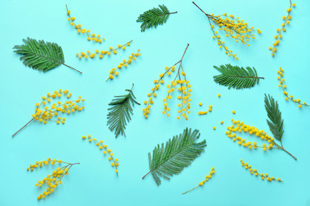 Mimosa twigs are spread out on a mint background. Spring concept. A top view of a flat image, place for text.