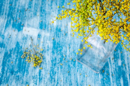 Spring flat lay. Stylish mimosa flowers composition on blue background. 8 march. Happy womens day and Happy Mothers day greeting card. Beautiful blooming mimosa pattern