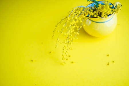 Mimosa a yellow flowers spring background, 8 march day background, frame with copy space, mimose is traditional flowers for international womans day 8 of march