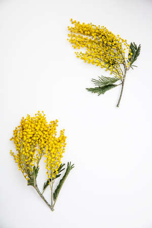Branches of yellow mimosa on a white background as a holiday card for Women's Day