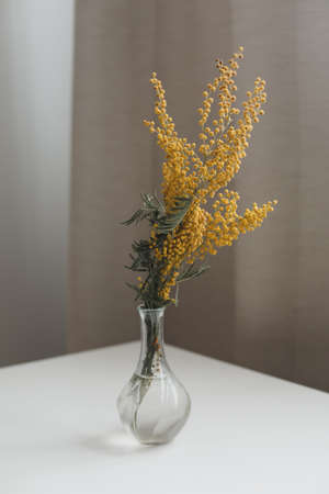Beautiful sprigs of mimosa in glass vase on windowsill. Yellow sunny flowers on white table near the window