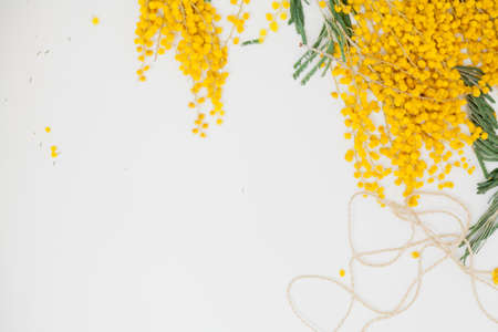 floral pattern of mimosa flowers on white backdrop. Copy space. Floral frame.
