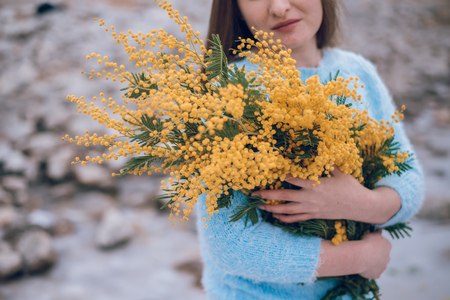 Mimosa yellow flowers in woman's hands, cropped. Spring concept. Woman's day symbol.