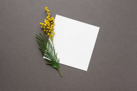 Blank for message and Bouquet of mimosa flowers on white background. International Women Day. Top view, flat lay