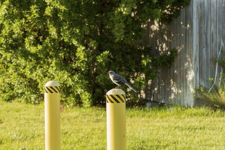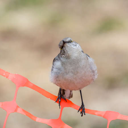 Mockingbird perched on Orange snow fence
