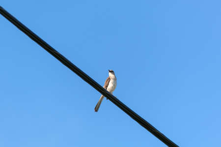 Bird on a wire against blue sky. Suitable for portrait or landscape backgrounds with sufficient area to permit cropping to show coming or going.