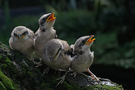 A number of young long tailed shrikes (Lanius schach) who are just learning to fly are perched on tree trunks covered with moss.
