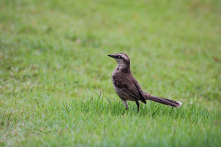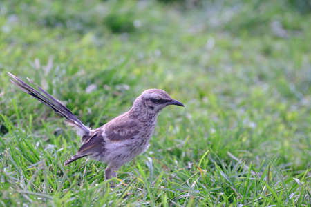 Long-tailed Mockingbird (Mimus longicaudatus) perched on fresh green grass.