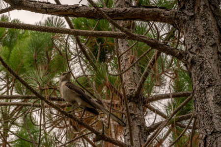 Long-tailed Mockingbird (Mimus longicaudatus) perched on the top of a cypress tree.