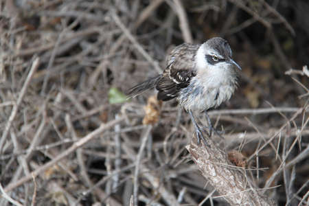 The Hood mockingbird (Mimus macdonaldi) also known as the Española mockingbird, on Isla Española in the Galapagos Islands