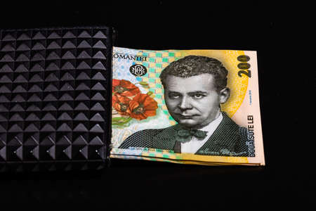 LEI romanian money banknotes in black wallet isolated