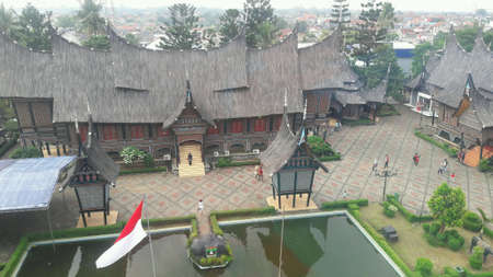 Aerial drone of royal palace in traditional Indonesian style. Istano Silinduang Bulan. Sumatra, Indonesia.