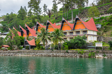 A row of Bataknese houses and villas on the shore of Lake Toba, North Sumatra, indonesia