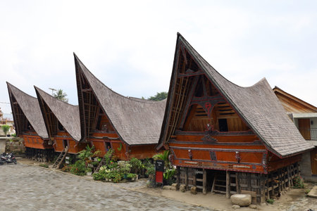Lake Toba, Indonesia - circa February, 2019: Batak traditional houses in a row at Ambarita village, lake Toba, travel destination in Sumatra, Indonesia.