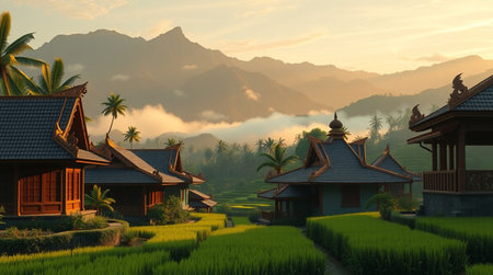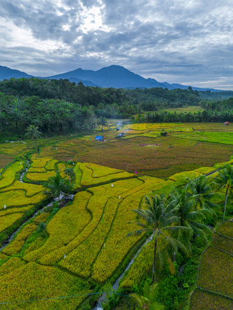 Amazing rice field area with stunning views and hilly backdrop in the countryside, the atmosphere is calm and peaceful