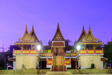 Traditional wooden Thai style pavilion at twilight, Wat Pho Thong, Bangkok, Thailand.