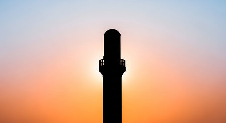 Sunset showing silhouette of a minaret tower against a vibrant sunset sky with orange and blue gradients. resolution