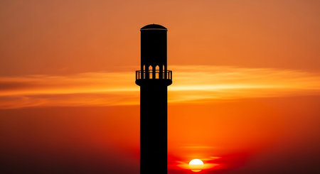 A striking silhouette of an Islamic minaret stands tall against a vibrant orange and red sunset, with the sun a glowing orb on the horizon.