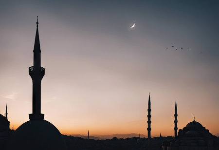A symbol of faith and tranquility. This image captures the beauty of an Islamic place of worship during the golden hour, featuring a clear crescent moon, representing hope and new beginnings.