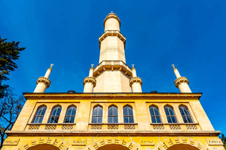 Lednice Valtice Cultural Landscape Area Complex Garden with Minaret Low Angle Front View and Picturesque Blue Sky in Spring