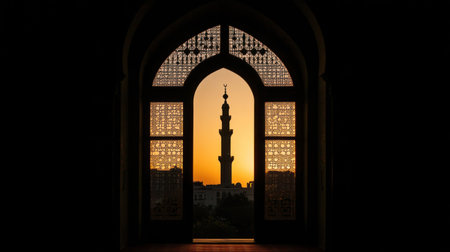 Photo of a sunset in a mosque window, with silhouettes of buildings and minarets visible through an open door against a black background, in a silhouette style. The image is beautiful, with ample copy space for text, a solid color background, and golden hour lighting. This is a high-resolution photography piece. --chaos 30 --ar 16:9 --v 6.1 Job ID: 657e4563-0378-4ccf-a41b-2bb15a60a77f