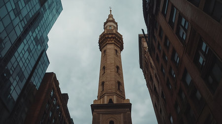 Majestic Minaret Cityscape Urban Architecture Tall Building Brownstone Modern Sky High View Grey