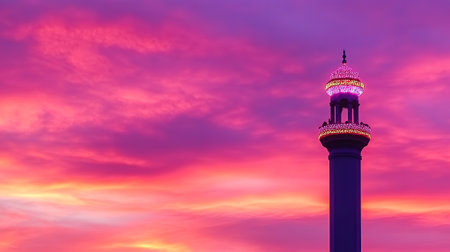 minaret in front of sunset background, front view
