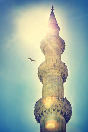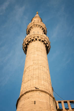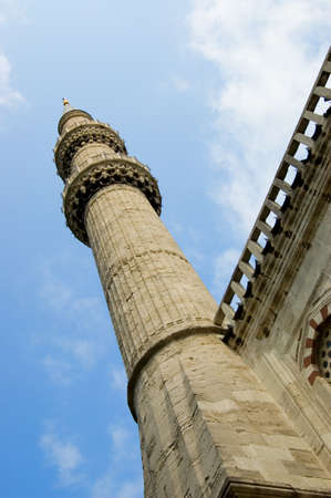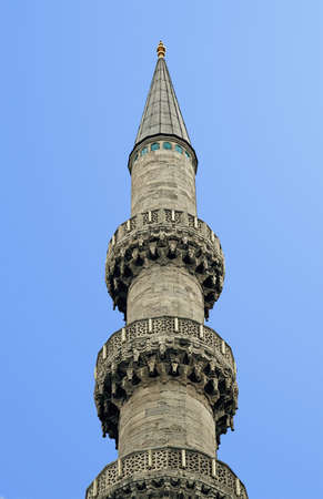 Blue mosque minaret and sky on a sunny day, Istanbul Turkey. The biggest mosque in Istanbul of Sultan Ahmed (Ottoman Empire).
