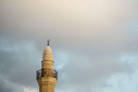 Tower of Bahr Mosque or Sea Mosque on blue sky background. Old city of Jaffa, Israel.
