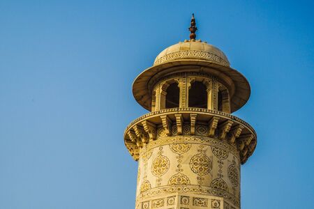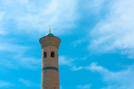 The top of the minaret of the mosque in Tashkent Minor against the blue sky, Uzbekistan.