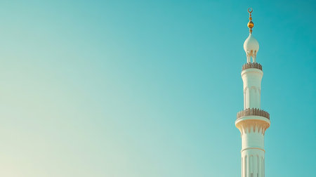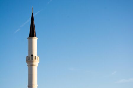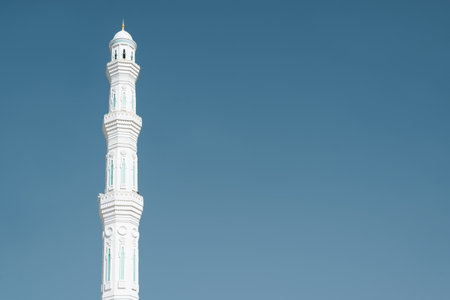 Tall white minaret against clear blue sky with copy space. Oriental architecture tower for prayer notification, outdoors.