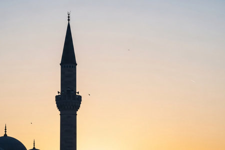 A minimalist photo of an Ottoman minaret silhouette against a soft pastel dawn sky, with a gentle golden glow from the horizon, evoking a peaceful Eid morning.