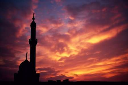 a mosque silhouette against a colorful sky, symbolizing the importance of prayer during Ramadan.