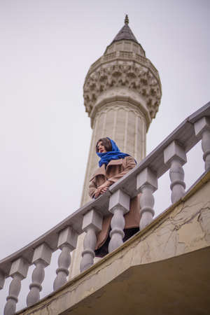 Exterior religious building of Islamic religion and faith. Mosque with high minarets on a sunny autumn day against the sky, outdoors.