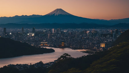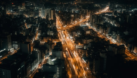 Twilight panoramic view of busy financial district above illuminated city generated by artificial intelligence