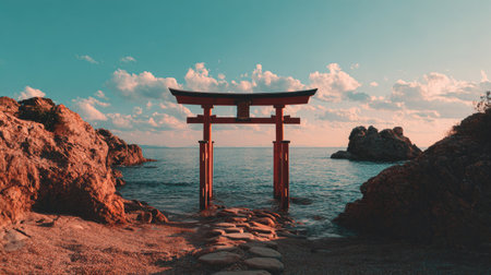 An image showcases a traditional Japanese torii gate situated in the ocean. The scene features a gate with pillars in the water, framed by rocky formations and a serene sea. The composition, bathed in soft lighting, highlights the gate against a clear sky, suitable for various applications.