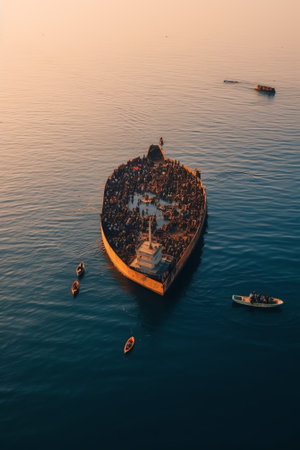 Generative AI : Aerial view of people kayaking in a lake at sunset Sea of Galilee Israel