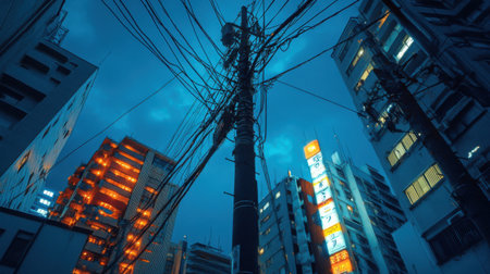 Urban nightscape in Japan with a tall telephone pole stretching toward overhead cables, surrounded by futuristic neon-lit skyscrapers.