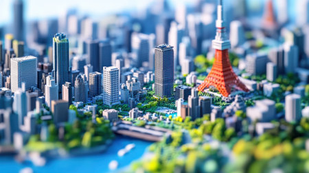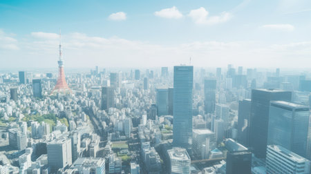 A breathtaking view of Tokyo's skyline showcases tall buildings and lush greenery. The iconic tower stands prominently amidst the bustling urban environment, reflecting a vibrant city life.