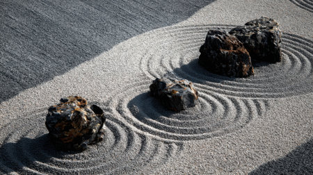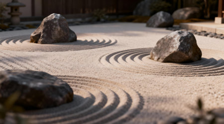 Experience the tranquility of a Zen garden featuring arranged stones and raked sand, inviting mindfulness and serenity amidst nature's beauty and artistry.