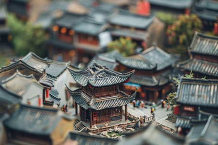 People stroll along cobblestone paths, surrounded by traditional architecture featuring elaborate roofs and greenery, creating a vibrant, historic atmosphere.