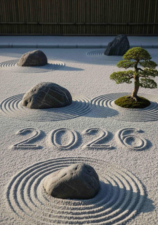 Japanese zen garden in the early morning, new year's day