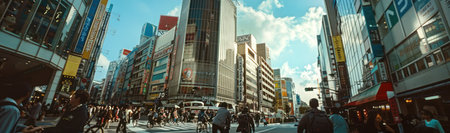 Busy Japanese city street with towering skyscrapers, people walking on sidewalks, gray and white buildings, perfect for travel agency, tours, urban landscape photography, Japan tourism, city life